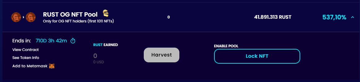 When the NFT is locked you will be presented with the option to stake $RUST. Hit the Stake button and a modal will appear where you can choose the amount of $RUST you want to stake. Click confirm and your $RUST will go to the pool.